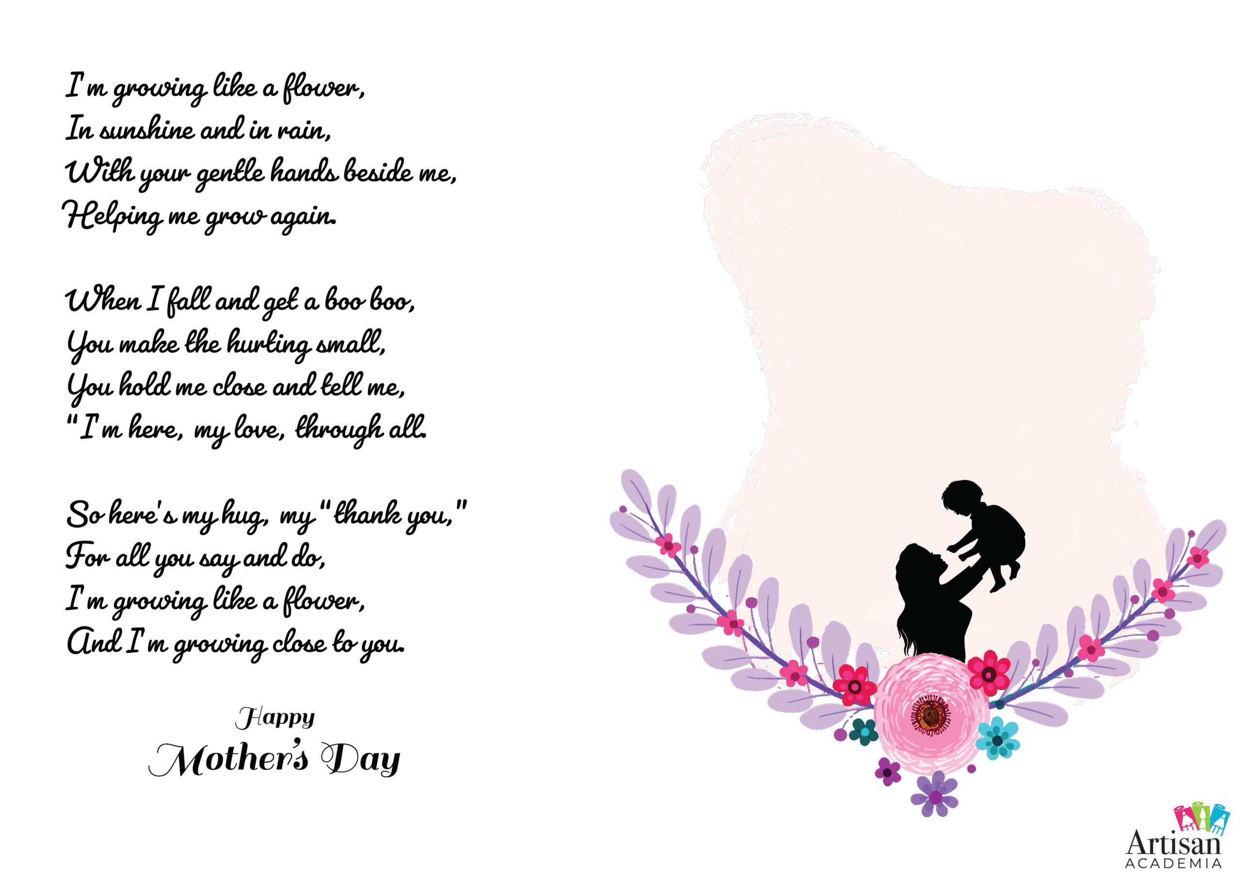 The poem touchingly describes the journey of growing through “sunshine and rain,” acknowledging the support caregivers provide during difficult moments[cite: 181, 183]. As a low-prep PDF download, children can personalize this resource by adding their own handprints or fingerprints to represent the blooming flower, creating a unique Mother’s Day gift[cite: 181, 186, 187].