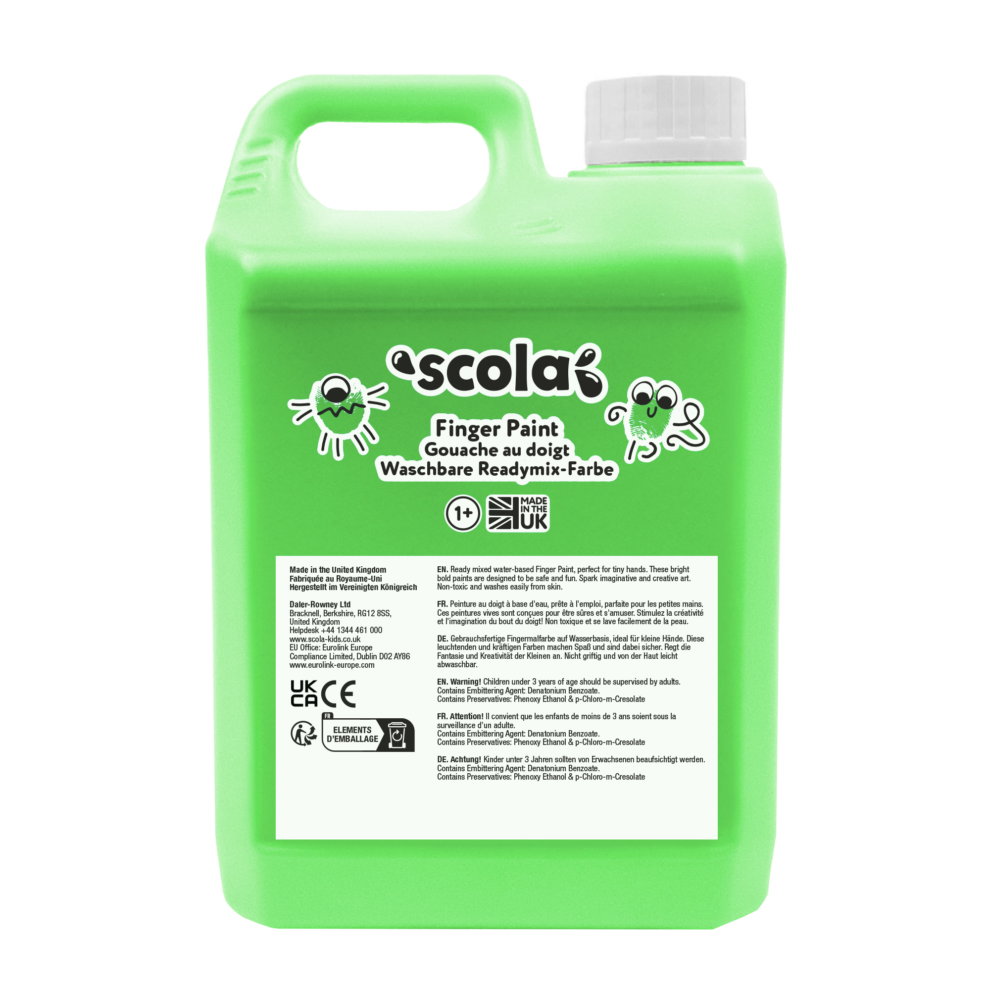 Scola finger paint in brilliant green is perfect for hands-on, sensory art. The smooth, creamy texture lets children explore colour, pattern and mark-making without the need for brushes, helping to build confidence and fine motor skills. Manufactured in the UK using recycled plastic containers, this high-quality paint is allergen-free, non-toxic and tested to cosmetic safety standards for use with children under 3 years.