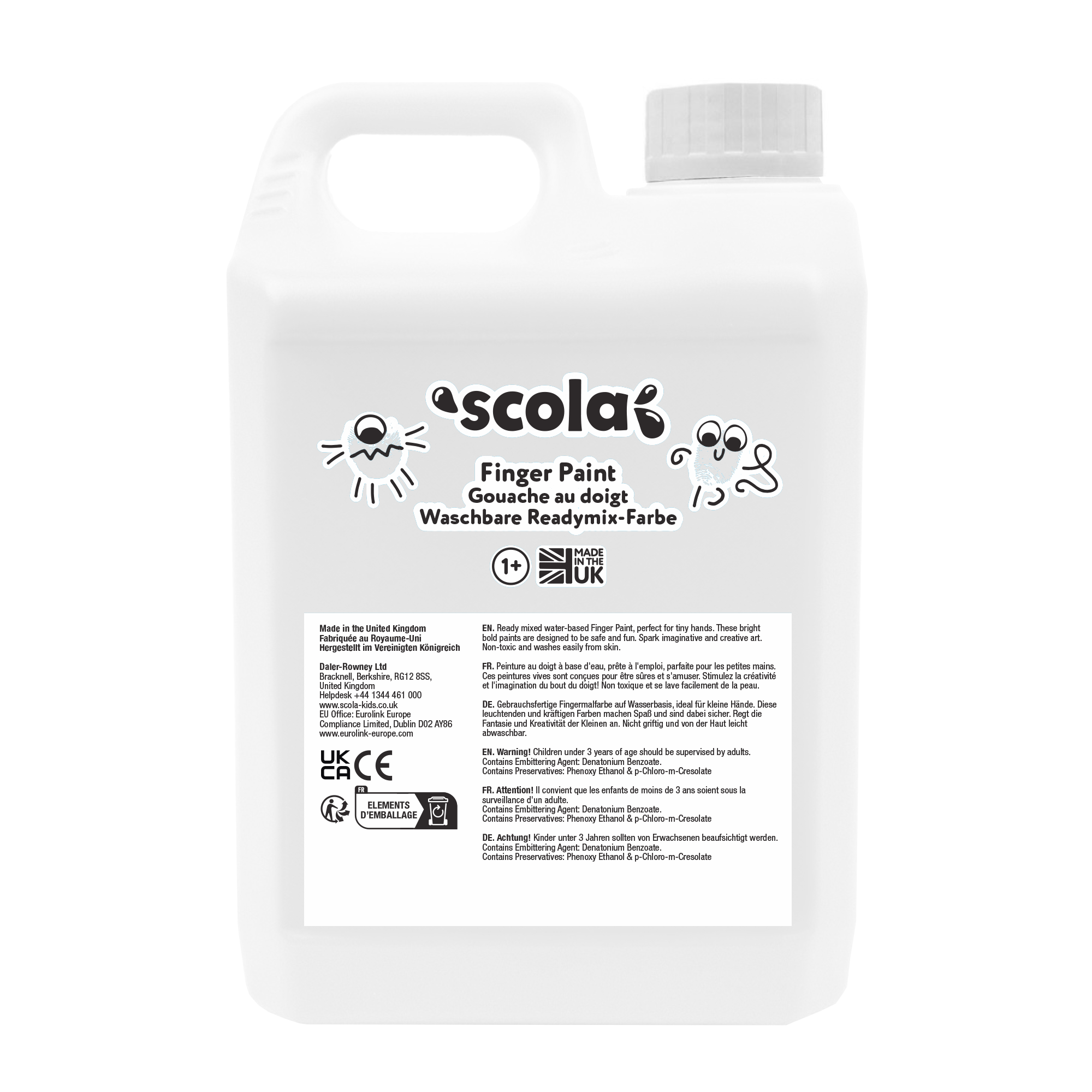 Scola finger paint in white is perfect for hands-on, sensory art. The smooth, creamy texture lets children explore colour, pattern and mark-making without the need for brushes, helping to build confidence and fine motor skills. Manufactured in the UK using recycled plastic containers, this high-quality paint is allergen-free, non-toxic and tested to cosmetic safety standards for use with children under 3 years.