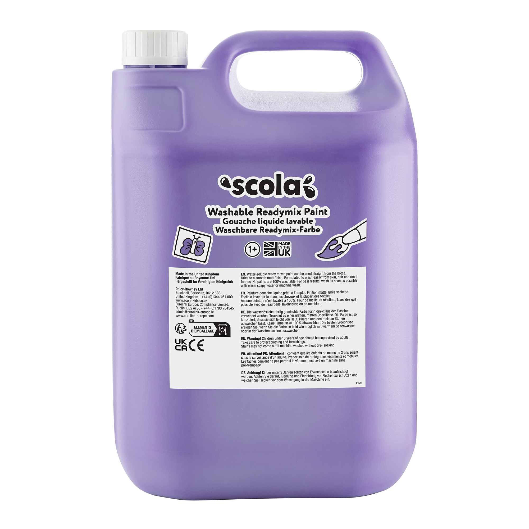 This Scola washable readymix paint in purple provides bold, opaque colour for everyday art and craft. The ready-to-use liquid formula pours easily from the large 5 Litres bottle, making it perfect for busy classrooms, nurseries and art rooms. Fully intermixable and water-based, it is quick to set up, simple to use and easy to clean away after painting sessions.